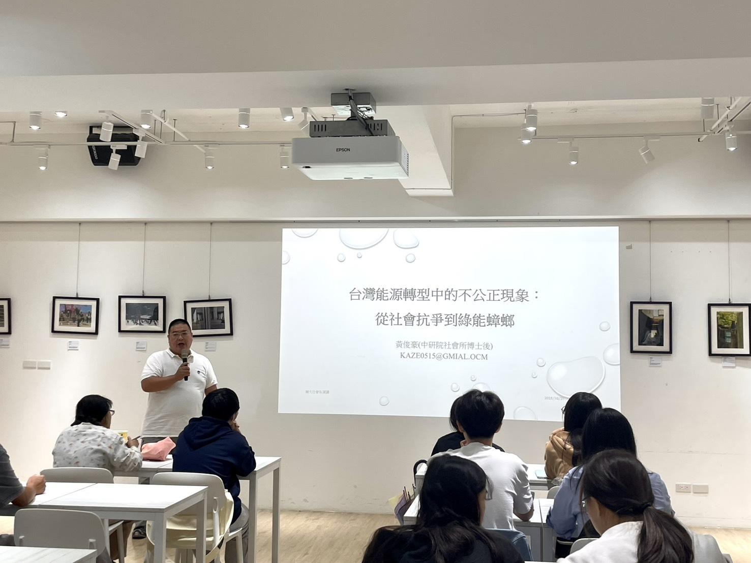 於2025年10月21日在校內舉辦學術專題講座,邀請中央研究院社會學研究所博士後研究員黃俊豪博士主講,深入探討台灣能源轉型下的社會抗爭與「綠能蟑螂」議題。