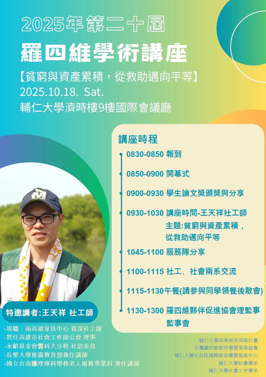 今年的主題是-貧窮與資產累積:從救助邁向平等,由南高雄家扶中心資深社工師 王天祥,帶領我們從第一線實務出發,思考社會救助如何邁向真正的平等與資產累積。同時也使兩系的大一學生認識系上的資源,以期能掌握科系資訊與方向;講座中也頒發學生論文獎,鼓勵學生透過學術論文撰寫提升能力,並提供多元角度的視野供彼此互相學習。