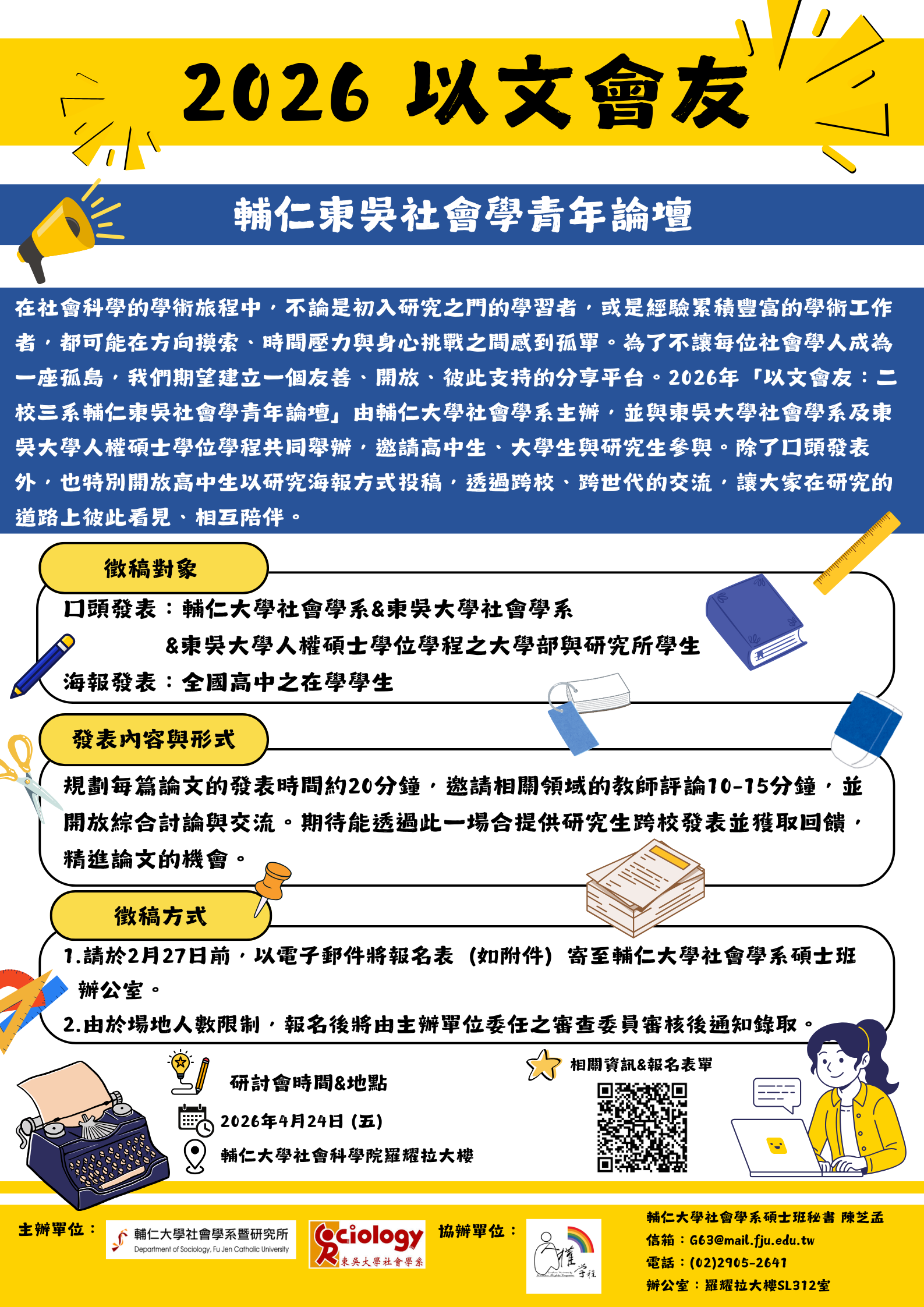 在社會科學的學術旅程中,不論是初入研究之門的學習者,或是經驗累積豐富的學術工作者,都可能在方向摸索、時間壓力與身心挑戰之間感到孤單。為了不讓每位社會學人成為一座孤島,我們期望建立一個友善、開放、彼此支持的分享平台。2026年「以文會友:二校三系輔仁東吳社會學青年論壇」由輔仁大學社會學系主辦,並與東吳大學社會學系及東吳大學人權碩士學位學程共同舉辦,邀請高中生、大學生與研究生參與。除了口頭發表外,也特別開放高中生以研究海報方式投稿,透過跨校、跨世代的交流,讓大家在研究的道路上彼此看見、相互陪伴。